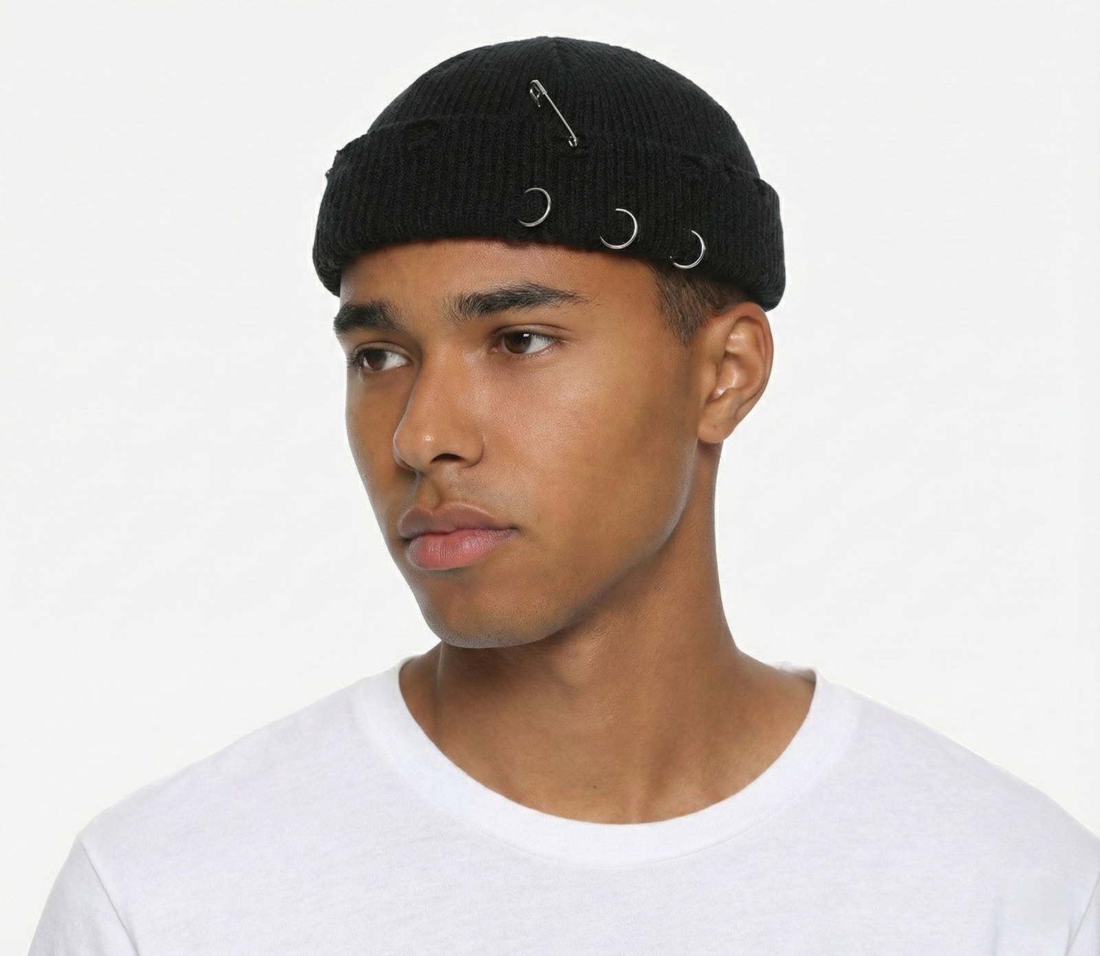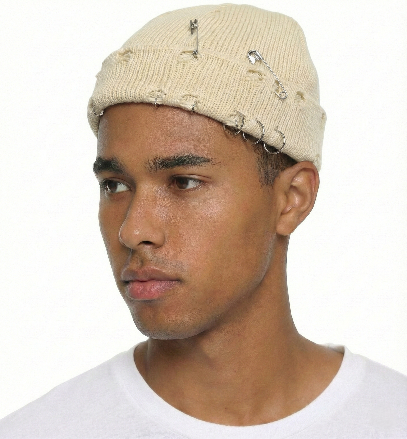 - Unique Design: Features a ripped, distressed look with rings and a safety pin for an edgy style.